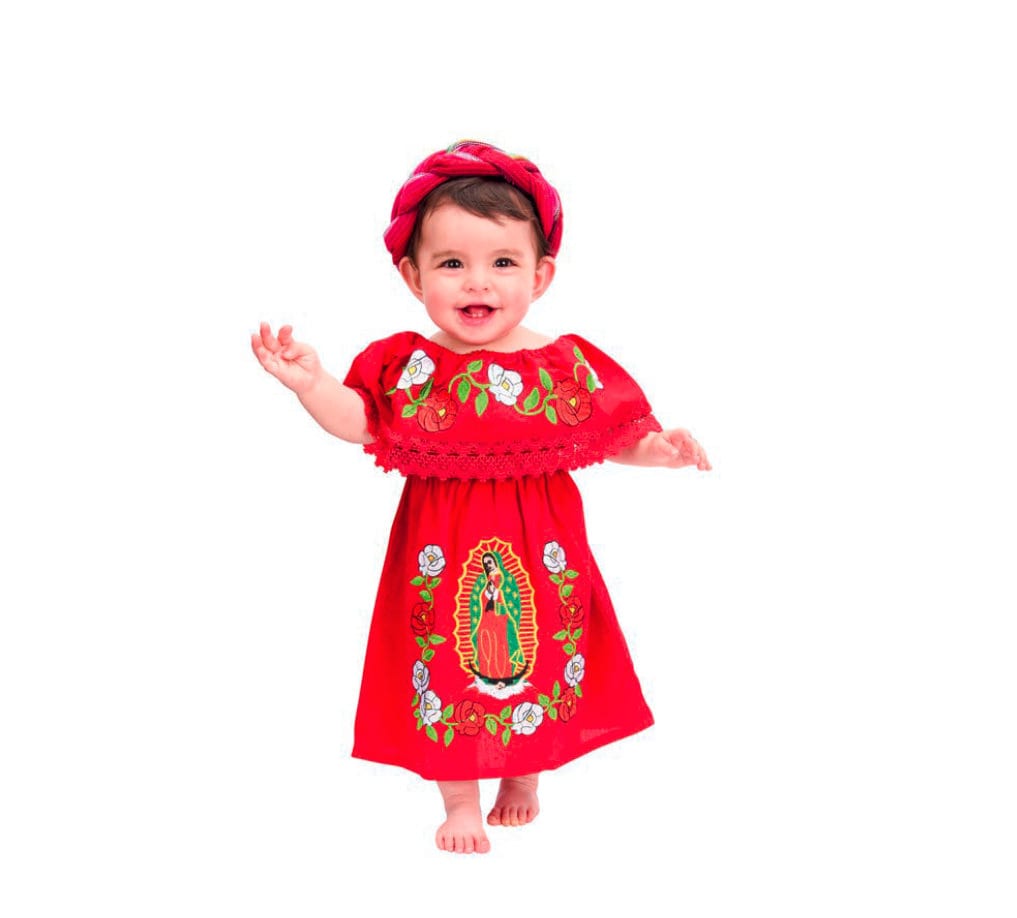 This beautiful traditional girls dress features hand embroider Virgen de Guadalupe with flowers.